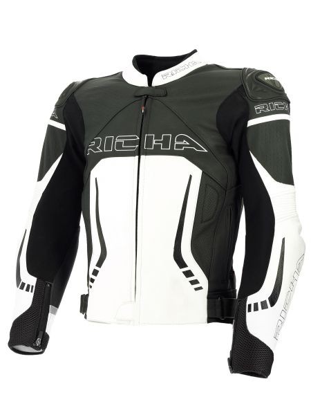 AUSSENMATERIAL Mix aus bestem Rindsnappa und Ziegenleder verbunden mit Stretchcomfort im Arm und Schulterbereich; Neopren im Kragenabschluss für besseren Komfort; aerodynamischer Buckel