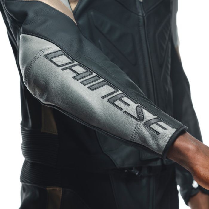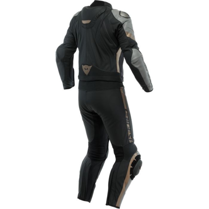 Combinaison de moto deux pièces en cuir de vache Tutu, avec curseurs en aluminium sur les épaules, bosse aérodynamique et empiècements élastiqués pour une liberté de mouvement maximale. Une icône Dainese.