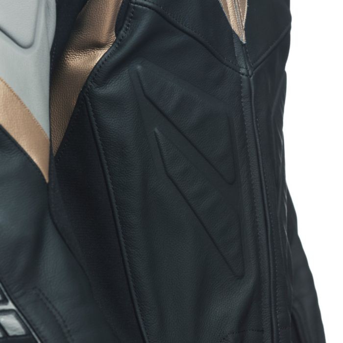 La combinaison Avro 4 est dotée de curseurs amovibles remplaçables sur les genoux et de plaques d’aluminium interchangeables sur les épaules : une technologie typique de Dainese, conçue pour aider et favoriser la glissade en cas de chute et éviter ainsi les roulements dangereux dus à l’adhérence sur l’asphalte. La bosse au niveau des épaules et de la nuque a une fonction aérodynamique.