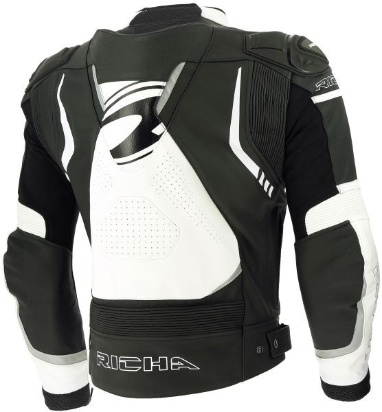 MATÉRIAUX cuir de vachette haute qualité combiné avec des cuirs de chèvre et du Stretch-Comfort aux bras et aux épaules;néoprène au col pour un confort supérieur; bosse racing aérodynamique.