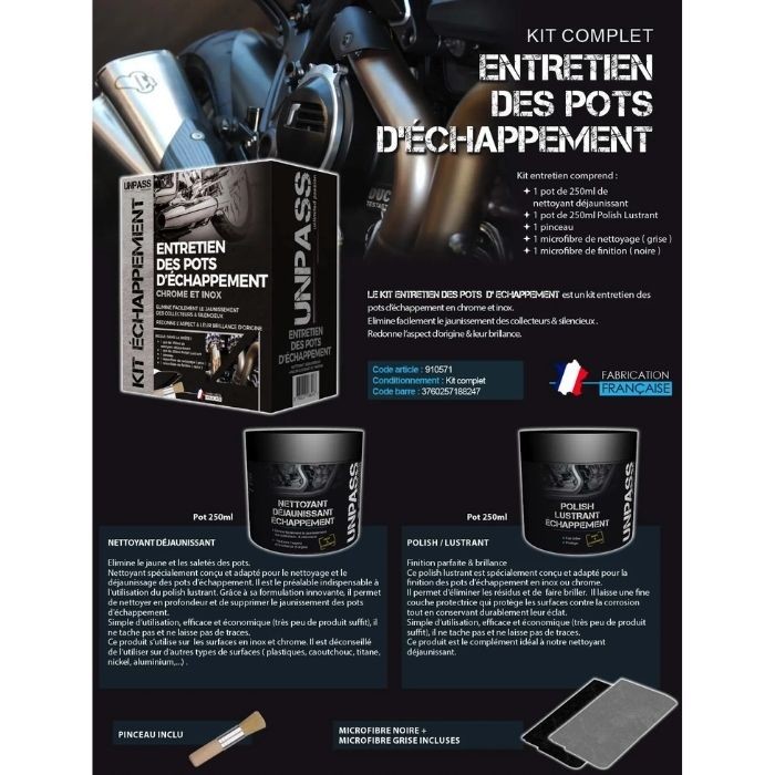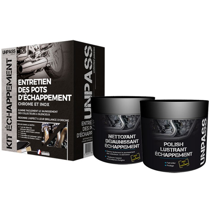 Pour l’entretien de votre échappement moto, UNPASS a développé un kit spécifique. Il permet d’éliminer facilement le jaunissement des collecteurs et des silencieux pour retrouver leur éclat d’origine. Il est efficace sur le chrome comme sur l’inox.
