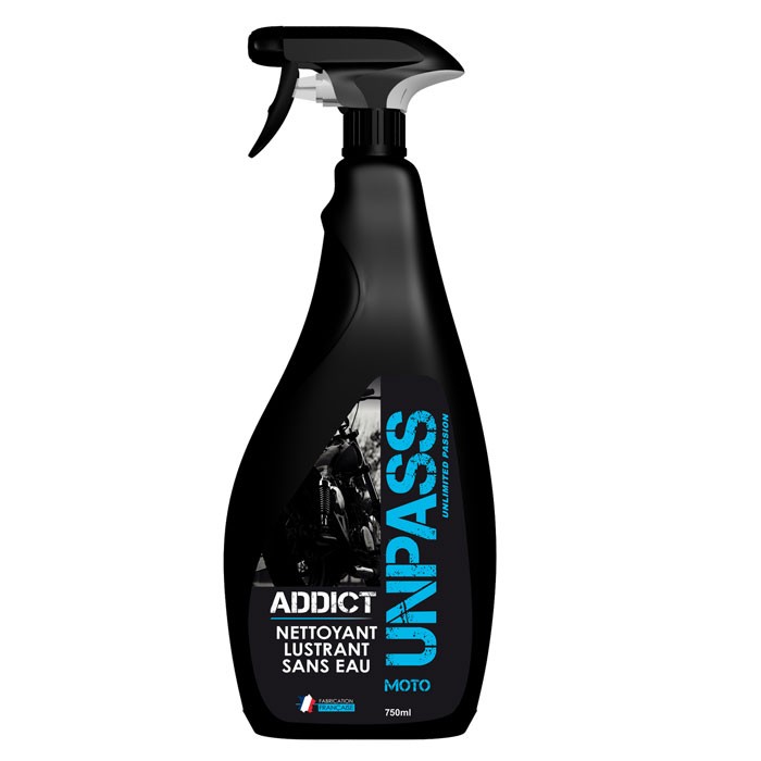 ADDICT 500mlNettoyant lustrant sans eauLes atouts d’ADDICT :•Nettoie et lustre l’ensemble de votre moto sans eau,•Pratique : s’utilise sur toutes surfaces (carénages, jantes, optiques, chromes, cuir, mate, brillante...) et sur tous types de matériaux (titane, carbone, alliages, aluminium...),•Facile : se pulvérise directement sur la zone à nettoyer,•Rapide : nettoie et fait briller votre moto en un temps record,•Efficace : dégraisse, démoustique, enlève les saletés les plus tenaces,•Protège : en déposant un film protecteur déperlant et antistatique,•Préventif : grâce à son effet filmogène, ADDICT facilite les nettoyages futurs.Mode d’emploi :•Agiter vigoureusement avant utilisation,•S’assurer que la surface sur laquelle vous souhaitez appliquer ADDICT n’est ni chaude ni mouillée,•Choisir le côté « fibres rases » de la microfibre pour nettoyer et le côté « fibres épaisses » pour la finition (sécher et lustrer), •Pulvériser ADDICT directement sur la surface à nettoyer,•Laisser agir 1 minute avant d’étaler ADDICT et de nettoyer à l’aide d’une microfibre (côté nettoyage),•Passer la microfibre (côté finition) pour sécher et lustrer la surface nettoyée,•Recommencer ce procédé jusqu’à ce que la moto soit entièrement propre,•Quand la microfibre fournie est saturée de saletés et de produit changer la par une propre.Conseils :•Utiliser de préférence notre microfibre fournie dans la version étui du produit. Sur notre microfibre le côté « fibres rases » est idéal pour le nettoyage,•le côté « fibres épaisses » pour la finition.•Ne pas appliquer ADDICT sur des surfaces mouillées et/ou chaudes et/ou exposées au soleil par de fortes températures.Addict est sans danger pour l’environnement et la santé.Addict est biodégradable.