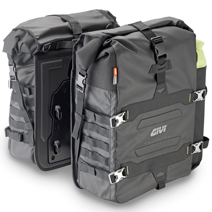 Paire de sacs latéraux, 35 + 35 litres avec platine. Conçus pour les motos Enduro et Trail. Déverrouillage rapide à partir des supports, avec les GIVI Security Locks (la serrure peut être identique au top case, trolley, ou à la boîte à outils à l´aide des kits SL102, SL103 ou SL105).